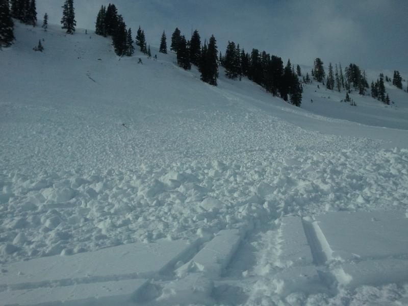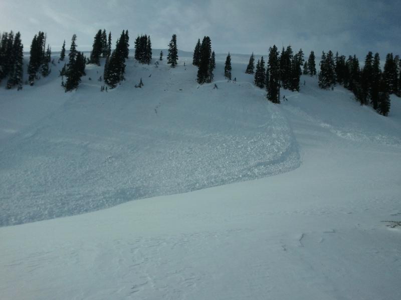 Triggered low on the slope and breaking into weak snow near the rocks on a steep, breakover. Images are before and after the slide.
