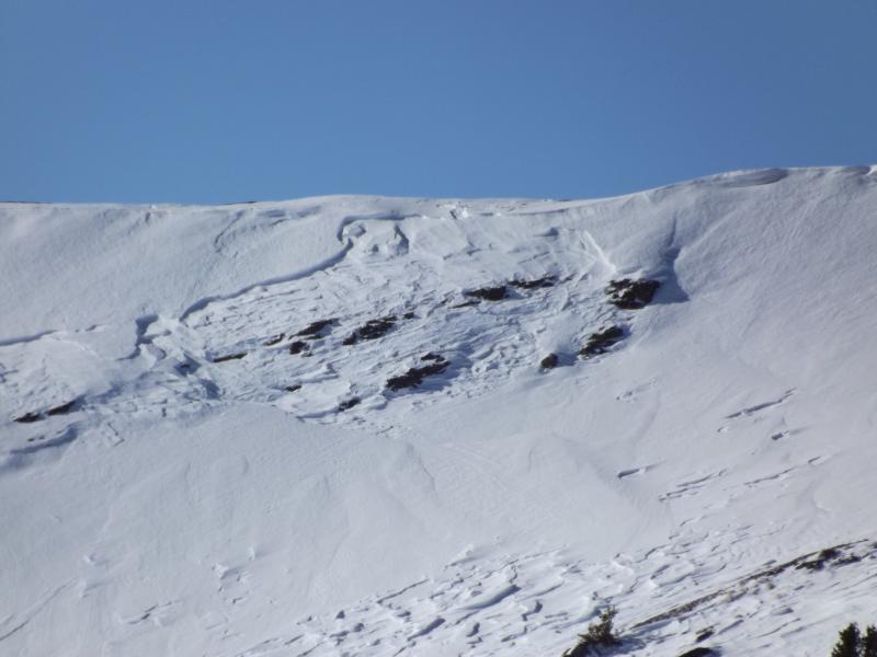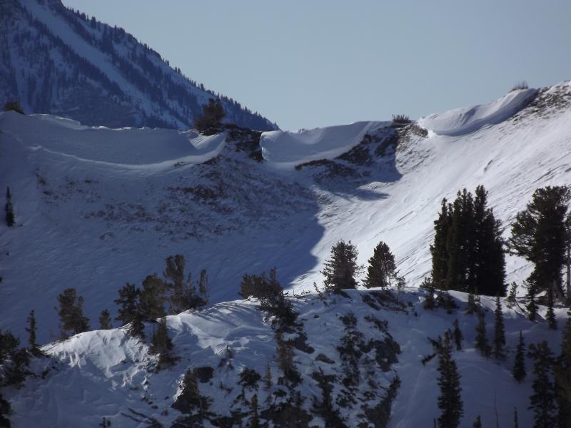 While doing some scouting in the far reaches of Snowbird's Mineral Basin, I noticed this slide on Major Evans off in the distance. It is hard to say exactly when this slide ran, but it must have been between the 1/11 storm and the 1/16 wind event. This terrain is seldom visited by humans due to the location and difficulty of access. In the photos there is a clear crown face and the bed surface had been scoured by the strong N and NE winds earlier this week. Notice the bald spot near the summit. This spot seems to always be devoid of snow and is indicative of the wind that flows through that drainage. Some large pieces of cornice/crown are visible in the second and third pictures, along with some severe wind damage to the bed surface.