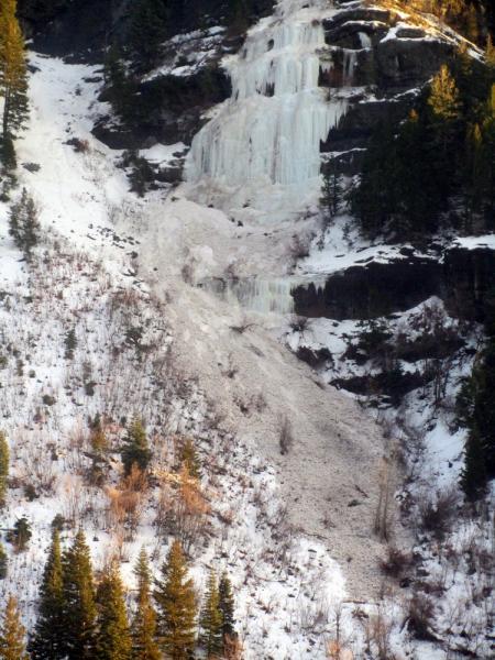 Same theme as yesterday as far as avalanche type just without any new precip. The warm temps continued to trigger steep slopes above the road on SR92 and elsewhere causing a few more closures. This pic below is from low in the Lost Creek drainage. Confined gullies are to be avoided.