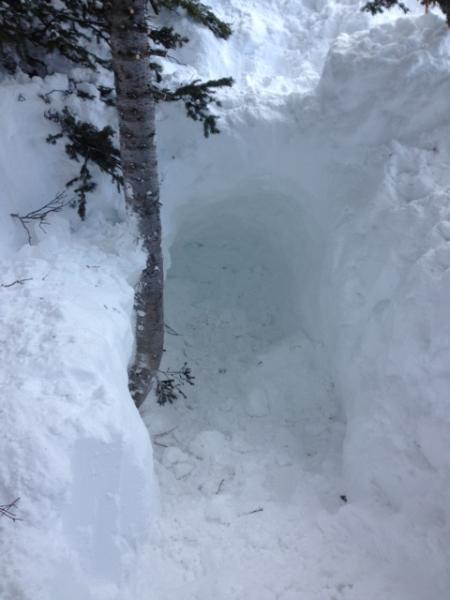 The snowmobiler was buried up against the trees in the bottom right of the photo.