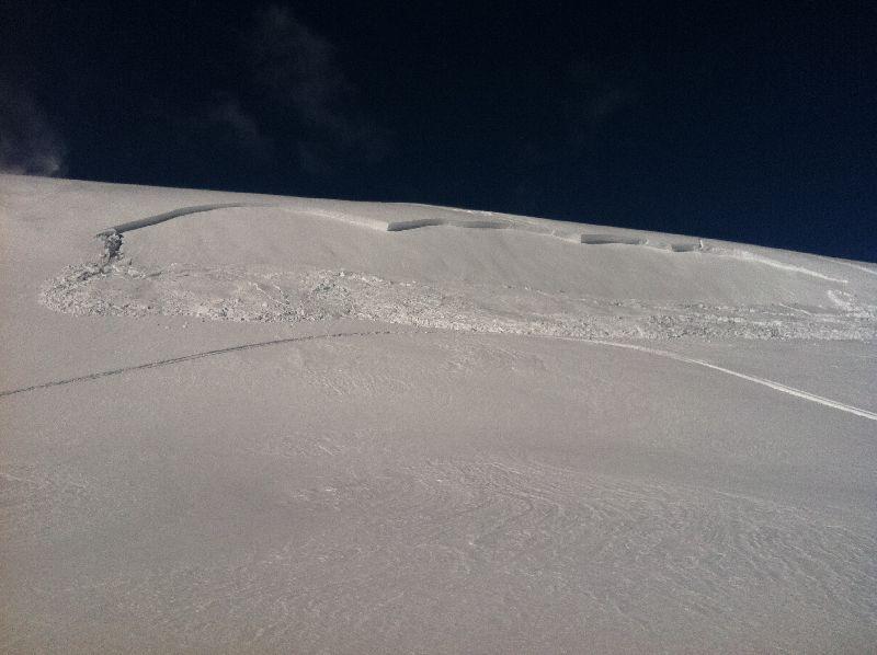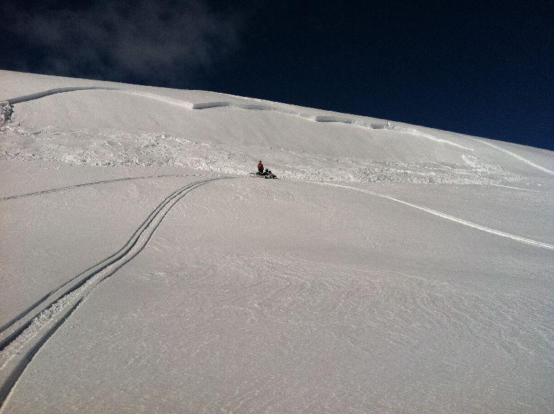 Snowmobiler triggered unintentionally. Climbing the lee-ward face of a short steep hill. The track that triggered it is in the upper right corner of the pictures. A second snowmobiler (me) was beginning to climb as the avalanche was triggered. I was able to pin the throttle and escape unharmed and untouched (the U-shaped track at the toe of the slide is the turn out).