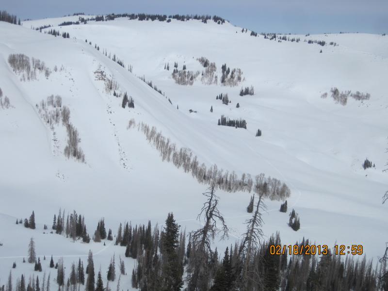 Came across this in our travels today. This area is a repeater, the usual suspect, ENE facing, exposed, wind stripped, shallow pack, and very rocky. Side by Side naturals occurred overnight or during yesterdays wind event that accompanied weak cold front. We were really surprised to see any activity, and while is was very fresh, our objective was across the valley, NW facing, more sheltered, and certainly the fattest snowpack in the area.