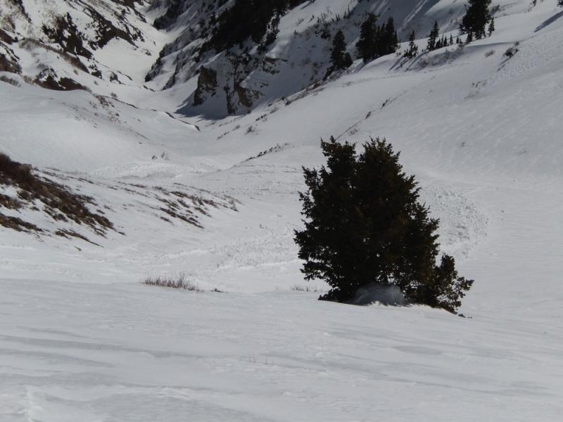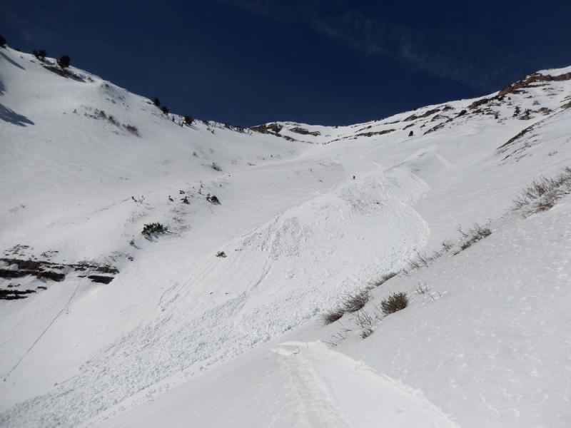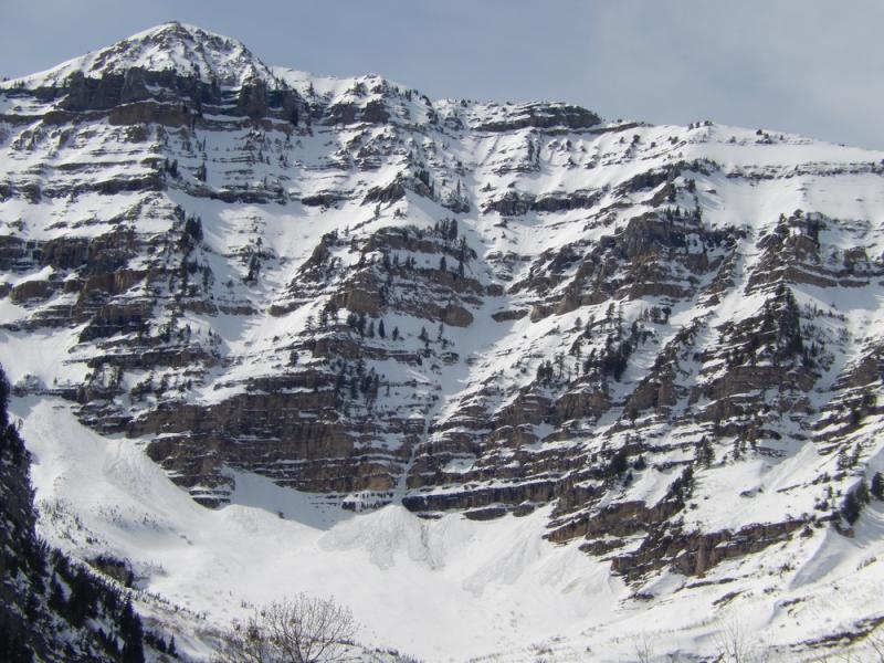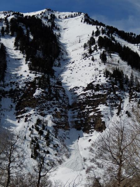As expected the rapid increase in temp was too much for many of the sun exposed slopes today. There was a widespread WL cycle throughout the Provo region today starting at about 11:00am at the mid elevation SE aspects and continuing later into the upper elevations. We saw wet activity on everything from due east to south. We were a little slower getting to our objective at the top of Slide Canyon than we would have liked and subsequently triggered this WL-ASu-R1-D2-O slide after my first three turns. The snow surface was firnspeigel so I didnt think I would get anything going until lower in the drainage. Once I saw my sluff gain mass I pulled up and let it go by. It slowly gained speed and entrained more snow, gouging in places, until it came to rest about 1700' below. Small slide on the scale of the drainage but definitely not one to get caught in. First pic is an overview taken later from the south fork road, second is from about half way down the slide, and third looking back up from near the toe.