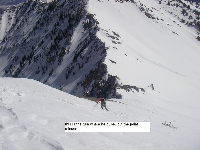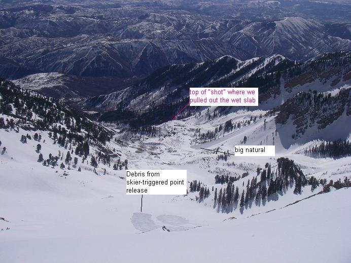 trying to exit provo peak area without getting kilt. we skied down a west facing line off the unnammed peak just to the east of provo peak, and it was.....uh..."punchy" (ie we were trenching). we triggered a point-release slide from near the summit of provo peak on a 40ish degree slope, and it entrained a fair bit of snow as it moved slowly down. We tried to get on a w. facing, somewhat-low angle slope to get off the peak and generally it worked well (we didn't trigger another avalanche, but were barely able to ski b/c we were punching through so badly that we could barely turn). down lower we got to a roll that went to maybe slightly over 30 degrees, and either skier A triggered it from midslope or - by his estimation -skier B triggered it as he shuffled toward the edge. it definitely was NOT a point release; it was a slab with a crown. It moved slowly enough that skier A was able to get out of the way by sort of comically straightlining at an equally-low speed, but the fact that it was heading into a gulley made for some momentary tension. Generally we realized it was way too hot and we were way too late, so we tried to mitigate as best we could, which was only marginally so. scary, and we all felt a bit dumb.