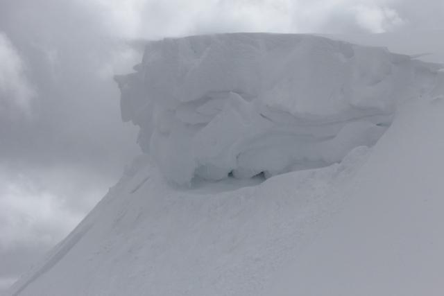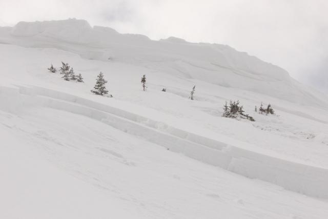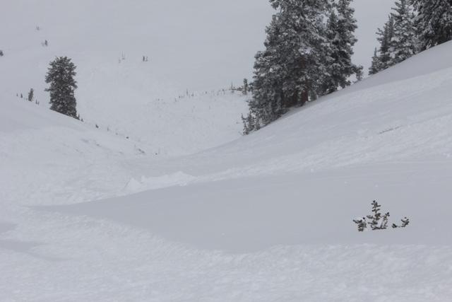 A very experienced local surfed a large piece of cornice that breaks behind him above a steep chute on Moffit Peak. The bus sized piece of snow pulls out a 2-3 ft deep x 50 ft wide hard slab that runs nearly 1000 ft vertically with the skier on board for the entire ride channeling his inner Laird Hamilton self. Fortunately all ends well.