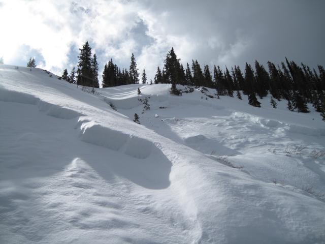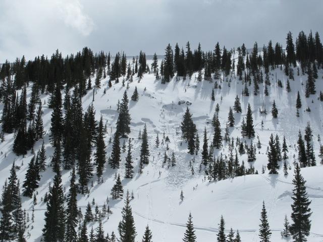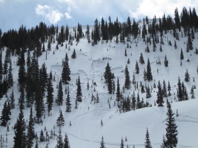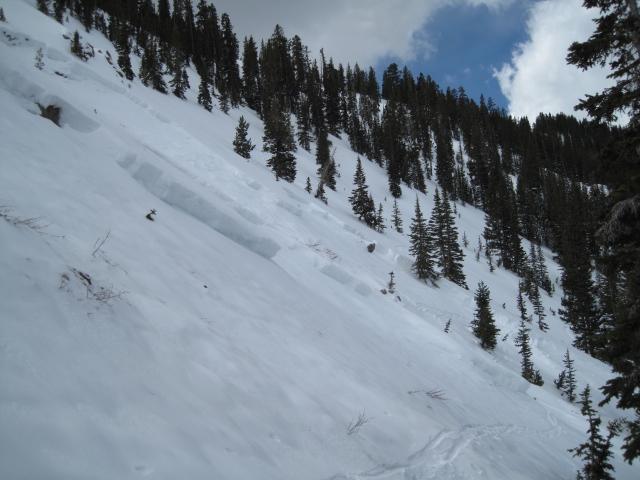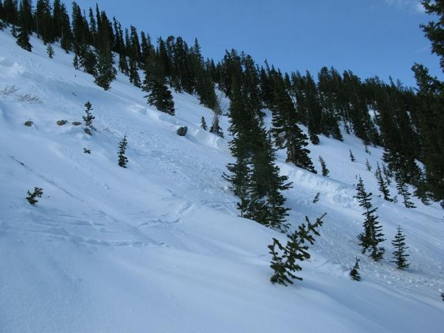 This sled triggered slide happened in the last few days on a steep, rocky north facing slope around 9,800'. A heat crust below the last storm snow may have added to the connectivity of the slide. The slide broke into old weak snow at the ground taking the seasons snowpack with it.