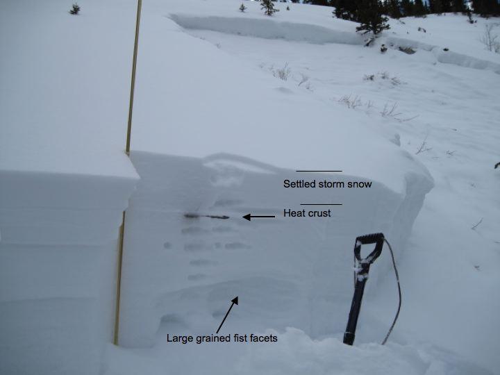 Steep, rocky, upper elevation terrain in this region never really developed a thick, solid snowpack this season. In addition, the very cold January temperatures added insult to injury. As a result the overall strength of the pack is super weak and remains suspect. Helping to hold things together is a thin heat crust from the meltdown two weeks ago.