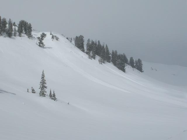 Went to grab Windy Peak and Giant Steps wx stations today. Nice storm for the eastern front. 14" snow with 1.4 H2O. A relatively calm morning turned quite breezy as the low moved east. ENE winds gusted into the 30's and 40's, forming sensitive soft slabs that were failing within the new storm snow. Not overly unmanageable but will probably be a different story tomorrow with a good blast o heat.