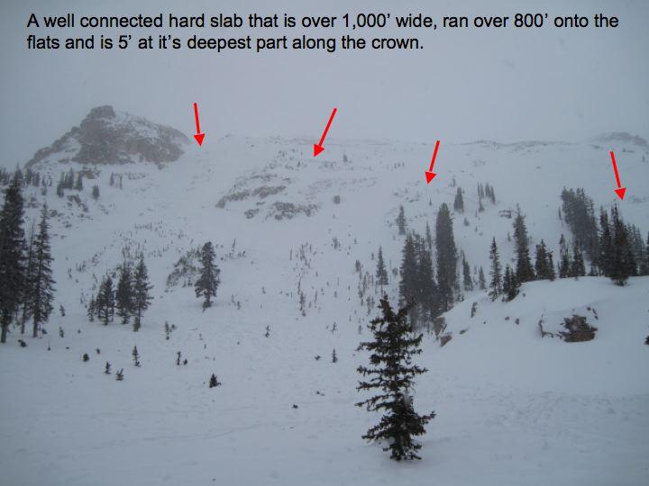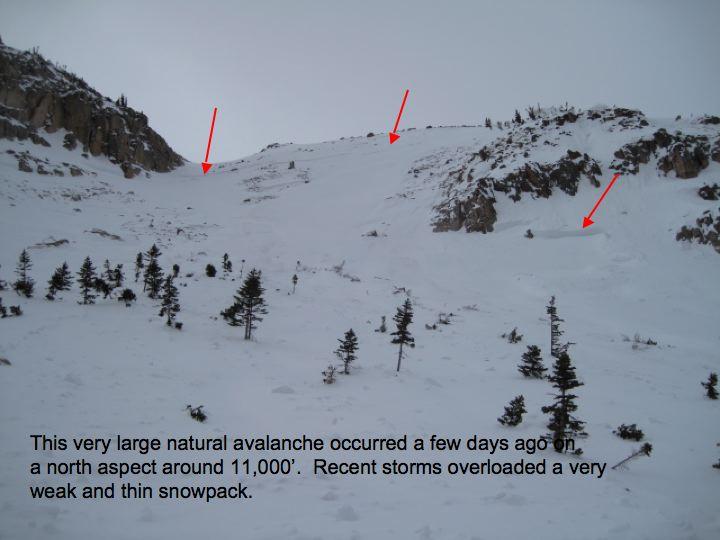 Another very large natural avalanche was spotted this week by some local riders in the Lofty Peak area. Steep thin, rocky and a weak snowpack became overloaded from recent storms. This is the second large natural avalanche that has happened each time the area receives strong winds, heavy snow and water weight.