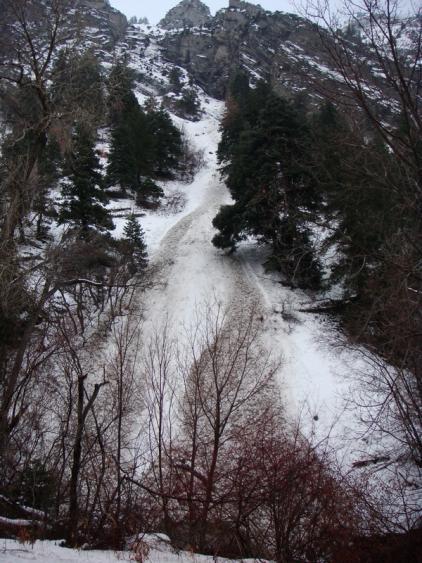 At the same time, similar slides were happening in Provo Canyon. This is a small path near Frasier Park called Snow Slide Jr. It ended at the Provo River bike path. A bit further down canyon near the popular ice climbing areas a couple more slides like this came out of The Fang ice climb and also the next one to the west. Luckily, no one was on these climbs at the time.