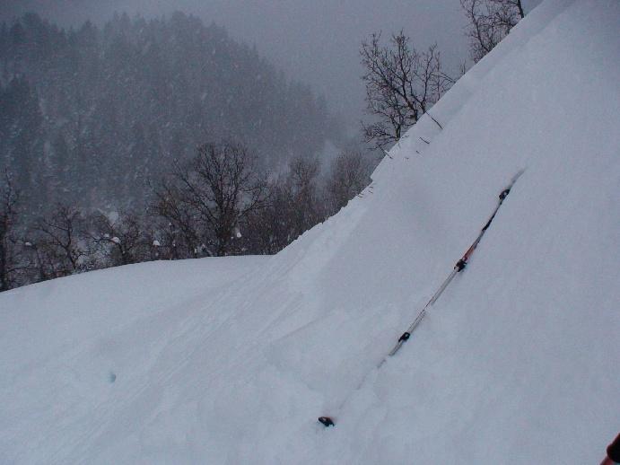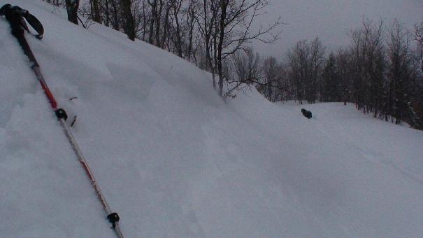 On our descent, took a whack at a road cut with my ski pole and triggered a shallow soft slab in the new snow (up to 10" deep), propagated up to 40 feet (see RoadCut_1 photo). Continued down the road cut and basically got the whole thing to slide, 10 to 50 feet at a time... (see RoadCut_2 photo).