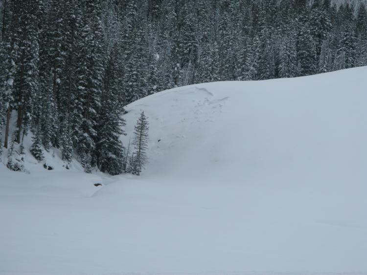 Just off of Highway 40, steep., windloaded road banks slid on weak snow near the ground