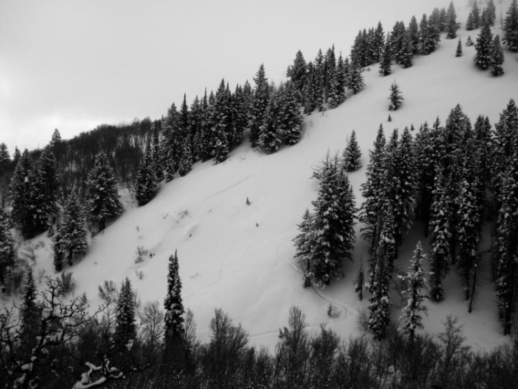 This slide occurred mid-slope in Cutler Basin, near 8500', NE aspect. Likely sympathetic to a larger slide. Not sure of the weak layer. There was evidence of many other slides in this basin, but the flat light made it hard to pick out many crowns. Based on the visible debris, several slides ran a good 800-1000' vertical.