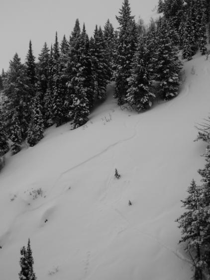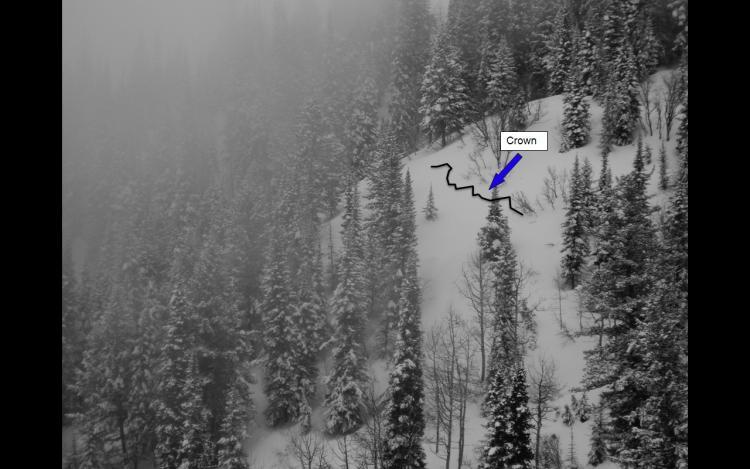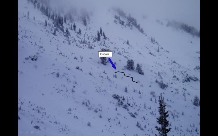Another slide, similar aspect and elevation, just a little farther up the ridge. Not sure of the trigger. Also suspect buried surface hoar, especially because the crown is in an open spot in the trees.