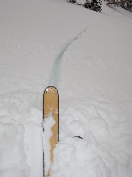 I had looked for surface hoar throughout the day because there were some surface hoar avalanches in the Ogden area mountains. Despite lots of poking around, I did not find any and even one full depth pit in a representative spot showed very solid snow. But we were watching our slope steepness very carefully and never got on anything much over 30 degrees all day. But when several members of the party gathered to the side of a small opening in the trees to regroup, they noticed the slide coming down to the side of them. No one is sure who triggered it. Since it was on such a gentle slope it moved slowly and was not much of a hazard.