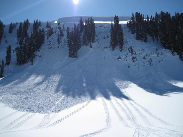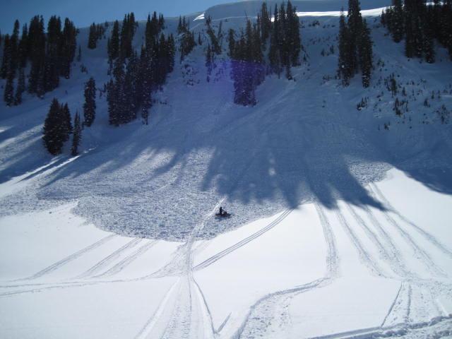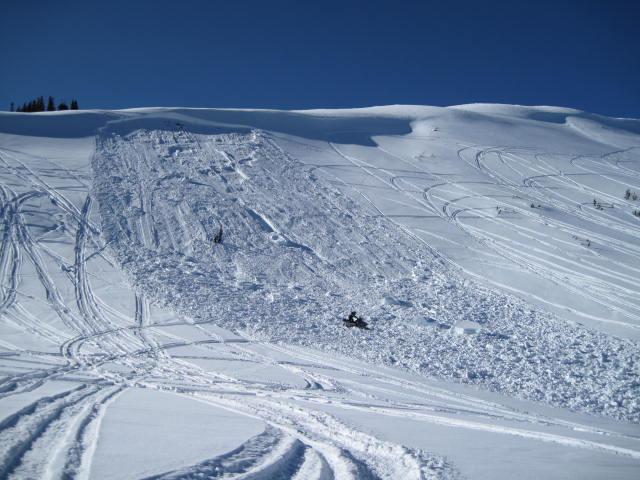 A small slide on the south end of Double Hill also looks to be human triggered. This one we think may have been triggered while a rider was decending from the ridge. We guesstimated the slide to be 3' deep at its deepest point, 150' wide 250' vertical and involved weak faceted snow at the ground and is on a northeast aspect above 10,000'. Lots of steep slopes were tested this past weekend.