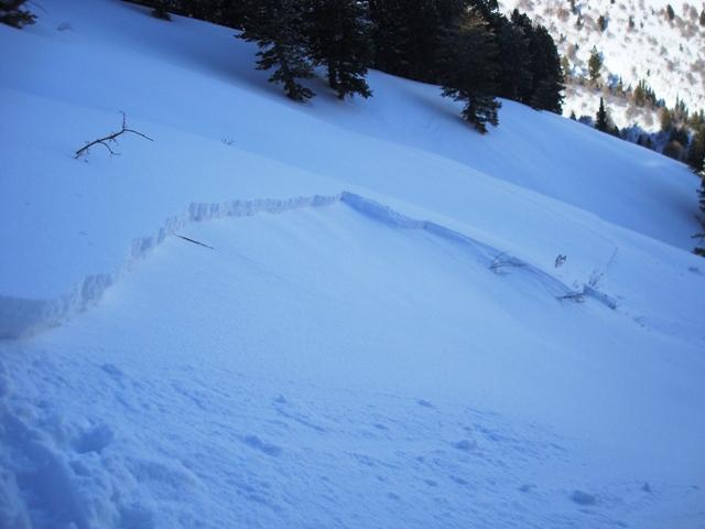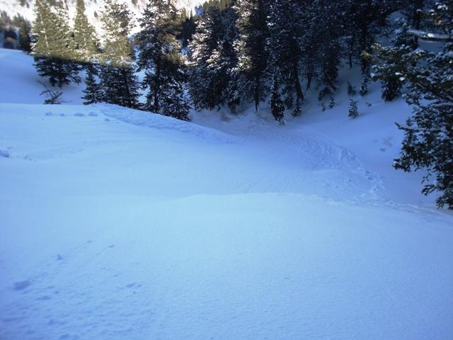 Triggered a soft slab that turned out to be the hangfire of another just previously triggered soft slab on a steep ene facing slope. My hangfire sympathetic'd out another crack a couple hundred feet away down to the left.Crack didn't run due to slope angle. Debris from initial slide was several feet deep as it ran into the steep walled terrain trap/gulley.