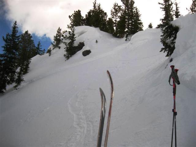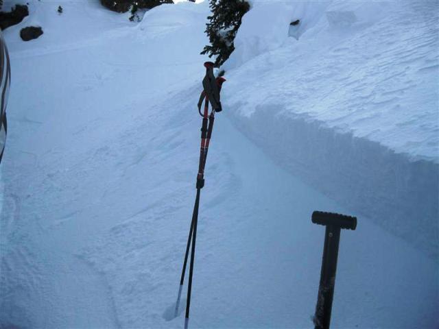 Soft Slab, North East, 9500-10000 feet in elevation, 38 degrees, averaging 12 inches deep with a small section 24 to 30 inches deep. 60 feet wide, breaking out to maybe 100 feet down lower. 500 feet vertical. Buried surface hoar weak layer. Triggered with a cornice drop. three woomphs heard on ridge, though we suspected it was caused more by layers within the cornice then anything else as they occured when nearing the edge. light winds, there was a wind pillow at the deepest part of the crown, though it was 40 feet or so from the location the slide was originally triggered at. no recent new snow, though the surface was good powder, probably around 12 percent. The skiing below the debris was A- snow. The crown face produced a CT-24-Q2 on the bed surface and then CT-30-Q2 about 4cm lower on another surface hoar layer. We had dropped several cornices prior to the trigger, though they were probably all around 100lbs. The trigger piece probably had me by a couple hundred pounds. Don't know whether this would have slid with my weight, but we called it quits anyway figuring no point in pushing our luck. Moderate with pockets of considerable seems like it describes the hazard accurately. Ya gotta love spacial variability.