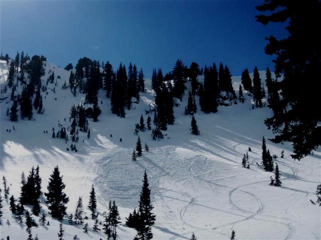Skiers left of Miller Hill, down canyon from Mineral Basin.