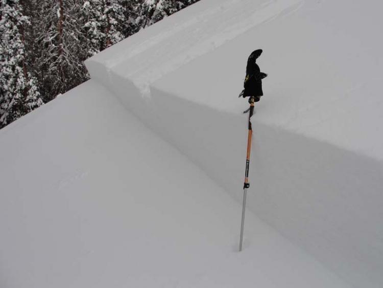 Due north aspect, slide was triggered @ ~9600 ft, in an open glade, pulled out the snow a good 150 ft. above that point. Crown lines and flanks followed trees/convexities. We suspect buried surface hoar/ near surface facets. Mostly soft slab. A picture of the crown which appears to be in the 12"-18" range.