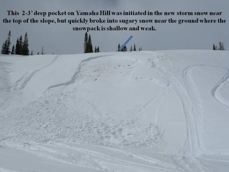 Normal 0 false false false EN-US X-NONE X-NONE MicrosoftInternetExplorer4 /* Style Definitions */ table.MsoNormalTable {mso-style-name:"Table Normal"; mso-tstyle-rowband-size:0; mso-tstyle-colband-size:0; mso-style-noshow:yes; mso-style-priority:99; mso-style-qformat:yes; mso-style-parent:""; mso-padding-alt:0in 5.4pt 0in 5.4pt; mso-para-margin-top:0in; mso-para-margin-right:0in; mso-para-margin-bottom:10.0pt; mso-para-margin-left:0in; line-height:115%; mso-pagination:widow-orphan; font-size:11.0pt; font-family:"Calibri","sans-serif"; mso-ascii-font-family:Calibri; mso-ascii-theme-font:minor-latin; mso-fareast-font-family:"Times New Roman"; mso-fareast-theme-font:minor-fareast; mso-hansi-font-family:Calibri; mso-hansi-theme-font:minor-latin; mso-bidi-font-family:"Times New Roman"; mso-bidi-theme-font:minor-bidi;} This slide illustrates exactly what we’ve been talking about nearly all season- avalanches triggered within the new snow or even a fresh wind drift can quickly break into weak layers of snow near the ground.