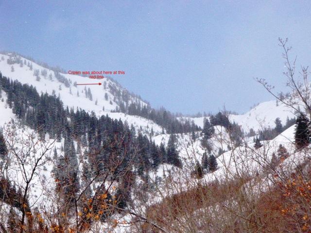 Deer creek canyon trail head to Box Elder cool and over cast, windy, NE winds on top of ridge, a bit of green-housing on lower elevations. East Ridge of Box Elder Peak, Cornice break causing avalanche. Crown around 20-24 inches, about 100ft wide and ran about 1000 vertical feet down a gully. It looked like snow broke just under the dirt layer from last big wind storm on Tuesday.