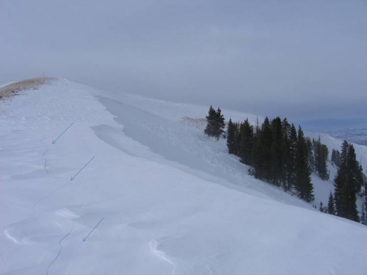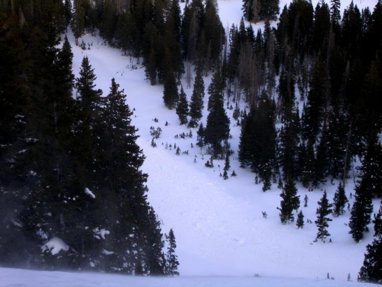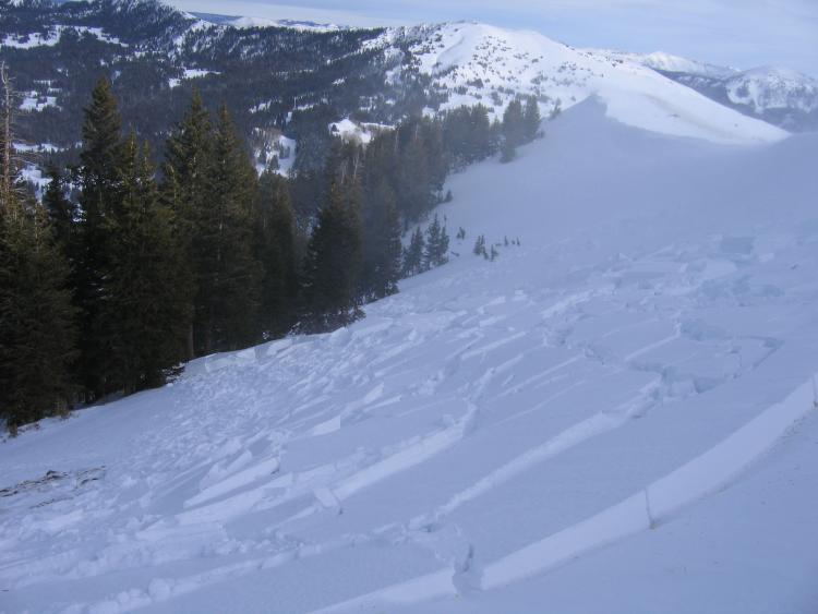 This large, remotely triggered hard slab avalanche was initiated from the ridge in a shallow portion of the snowpack on a heavily wind loaded north facing slope at about 10,500' in elevation.