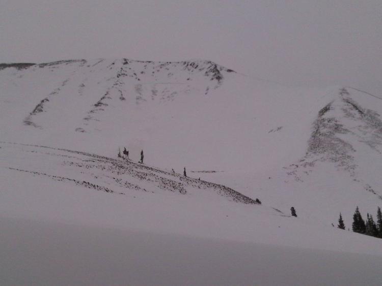 The Mellenthin slide is in the center of the photo There was a 2nd slide, below the dense tree line again on a N facing slope @ 10,900' above the Dark Cyn road, it was hard to see how far it slid, depth of crown was hard to determine, width was 200'