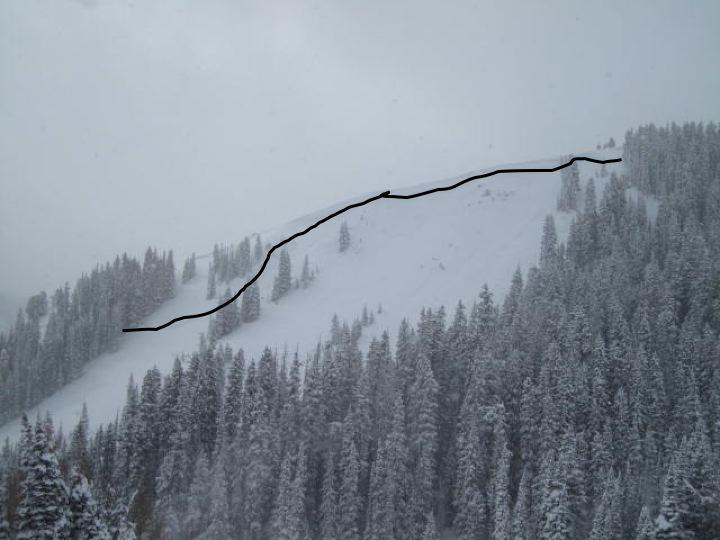 All along the Super Bowl ridgeline that faces northeast, I observed several natural avalanches that appeared to have been triggered by cornice fall which then triggered a deeper slide into older snow. The Uintas have been getting very strong south, southwest winds the last few days and the cornices have grown into some huge monsters. Yesterday, some riders reported seeing the aftermath of a very large avalanche in the area that broke trees and was the biggest slide they have seen in this area. I was not able to observe this slide due to limited visibility. Strong winds today should keep the hazard high with more natural avalanches likely.