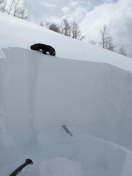 The depth of the crown averaged around 3' and we couldn't isolate a column without it failing on weak snow below the raincrust. My snow saw is on the bed surface. In a thinner portion of the crown we performed an Extended Column Test and got the column to fail with 11 taps, breaking below the crust.