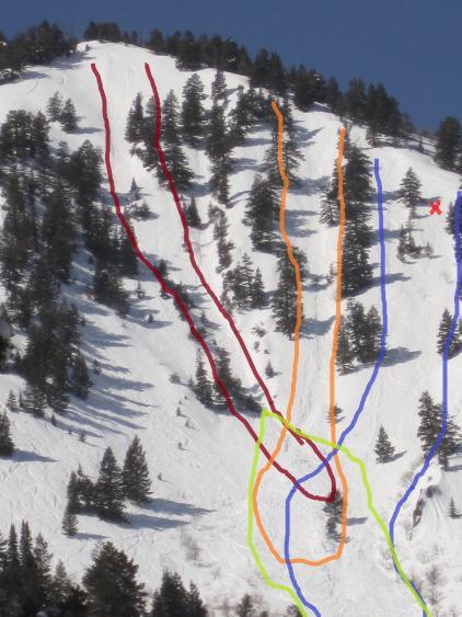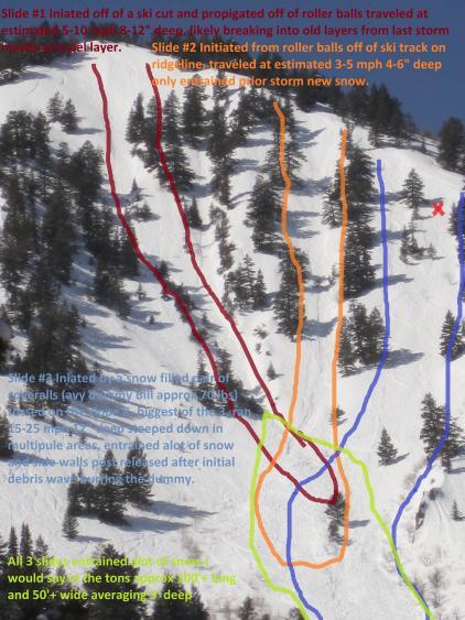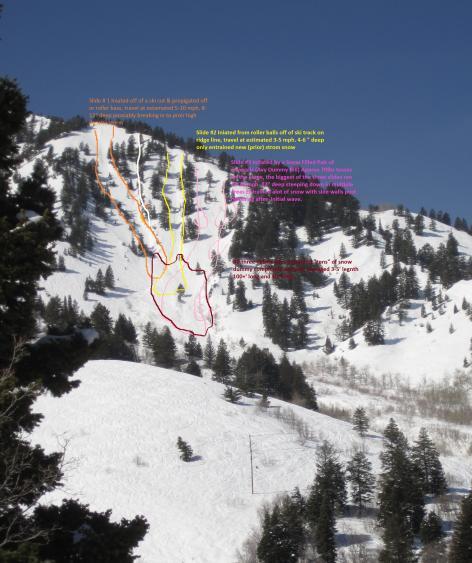 These slides occurred in the hells canyon area in the Snowbasin side country called "The toilet bowl" 3 slides total, all running quite fast! faster than a normal wet side. entrenching the ground and involving a lot of snow. Most were initiated by roller balls from ski cuts and propogated after roller balls were about basket ball size, sympathetic release on slide walls once debris pile passed. Special note on the 3rd slide, In my set up of a rescue senario for my avy class i experimented in deployment of my dummy Bil (blue shop cover all's) and filled him with snow (approx 70 lbs) tossed him down the slop and after flopping over once and 5-10 sec later he was off to the races.... took some impressive tumbles getting caught in a terrain trap and ended up getting wiped out by the post release from the upper side walls. the debris pile i couldn't ask for more for my class 75' wide and 100' long.