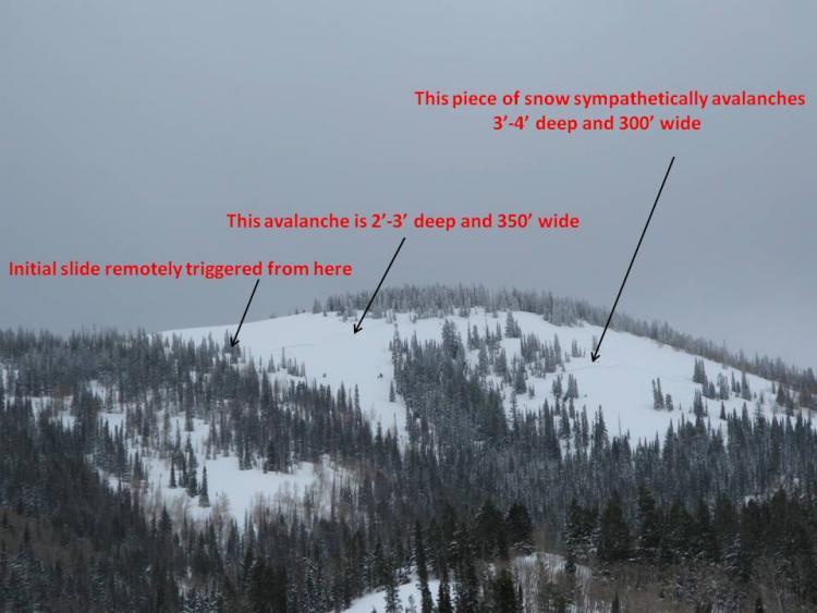 We visited the site where two very experienced, avy savvy local skiers remotely triggered this large slide near Slader Ridge in Upper Weber Canyon. The initial slide sympathetically released a large avalanche a couple hundred feet away to the south.