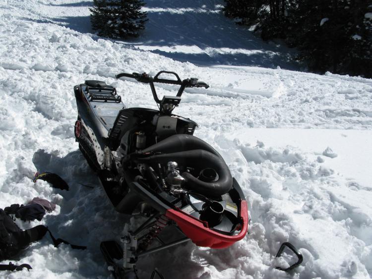 The damage to the sled is impressive. Missing seat, bend tunnel, and torn off hood...a true testament to the power of an avalanche.