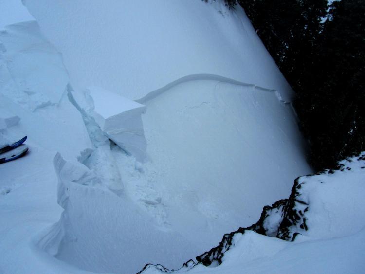 We triggered this hard slab with a cornice drop at 9500' in Chablis Bowl on a 38 Normal 0 °, NE windloaded aspect. It failed at the new/old snow surface.