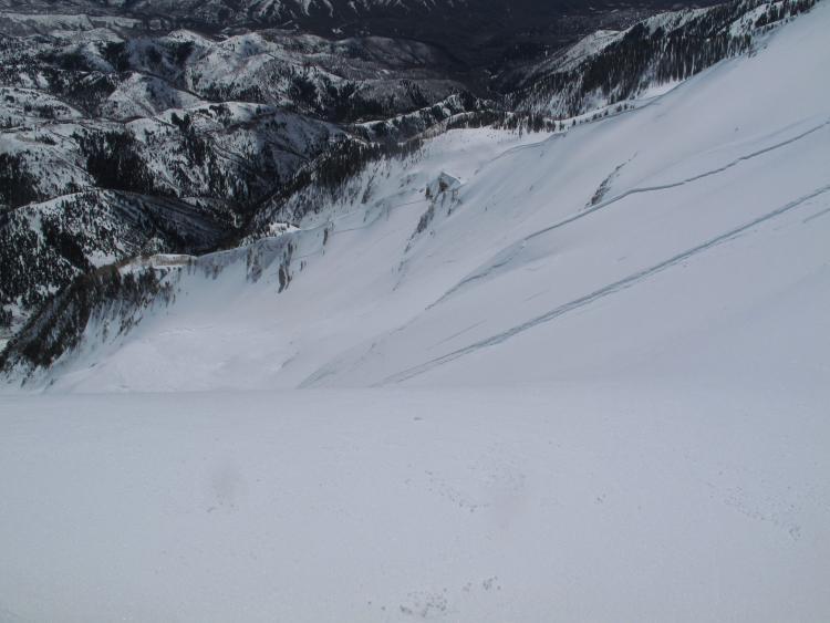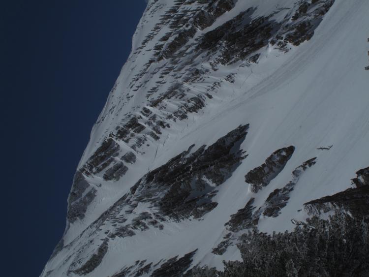 While hiking on the ridge to the summit our party noticed remnants of a large avalanche on the eastern face of Mt Nebo. The fracture line went all along the southern boarder of the face starting at around 10400', up to about 11200', across the bowl and to the northern edge (we could not see the northern edge of the crown therefore total width estimate is difficult, perhaps about 1/4 - 1/3 mile?). Depth appeared to vary but the crown looked to be about 1 foot for most of it. The debris appeared to have stopped mostly at the bench around 9700', but it looked like some debris ran into the gully far below. We decided to cut a cornice to see what affect it would have on the slope. With people C and D spotting, A and B approached the chosen cornice. Right where/when spotter C said to 'stop' the cornice released between A and B's feet. Luckily both stepped back onto the ridge. The cornice was about 20 feet wide, perhaps 10 feet out. It triggered another 200+ foot wide avalanche on the east face of Mt Nebo (it was very hard to see just how far the new crown propagated due to our extreme hesitation to get too close to the edge). This slide was above the fracture already observed and was thought to be the same new snow/old snow layer. It looked to be about the same thickness and ran to the obvious bench at about 9700'. At this time our party decided to retreat. Another Note/Observation A natural cornice fall had occurred sometime the night before in the NW couloir. This cornice fall then triggered a slide which propagated all the way down the chute to the apron. From afar we were not sure what exactly had happened but as we gained elevation we could see the point where the cornice had fallen from above a large cliff and landed in the couloir. As we got even closer we could see sympathetic crowns/fractures all the way down the chute on the looker's right side and we began to really understand and appreciate how huge the resulting debris pile in the apron was.