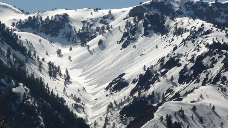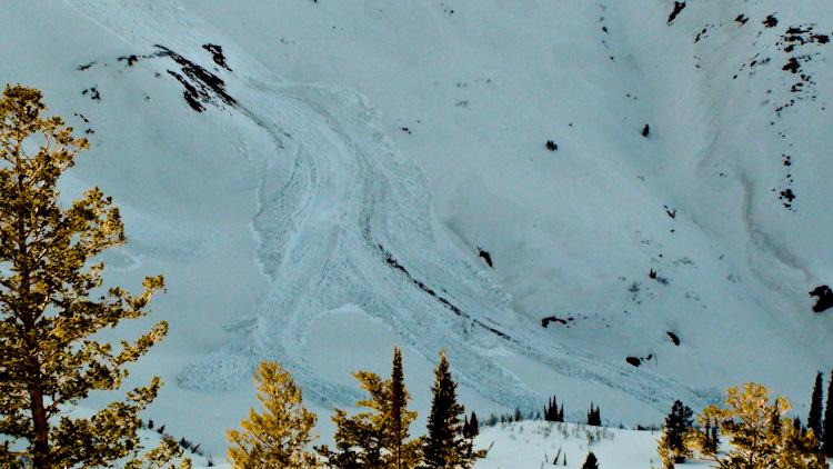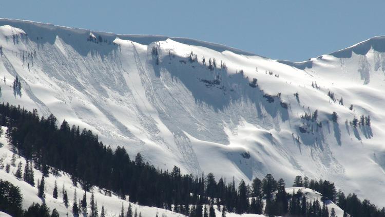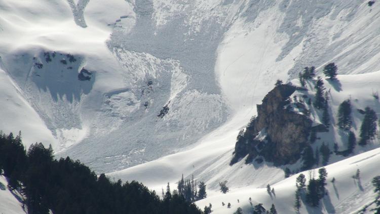 The second photo below tells the story. It looks like a cornice broke off of the ridge, triggering a small slab just off the ridgeline. This mass of snow tumbled downhill, trigger the much larger wet slab below. Despite only being 250 feet or so wide, it entrained a lot of snow throughout the path, triggering several sympathetic slabs below (see third photo). After running through a deep gully, the debris fanned out in several branches, and developed one deep channel that deposited the two branches on the left.
