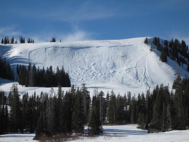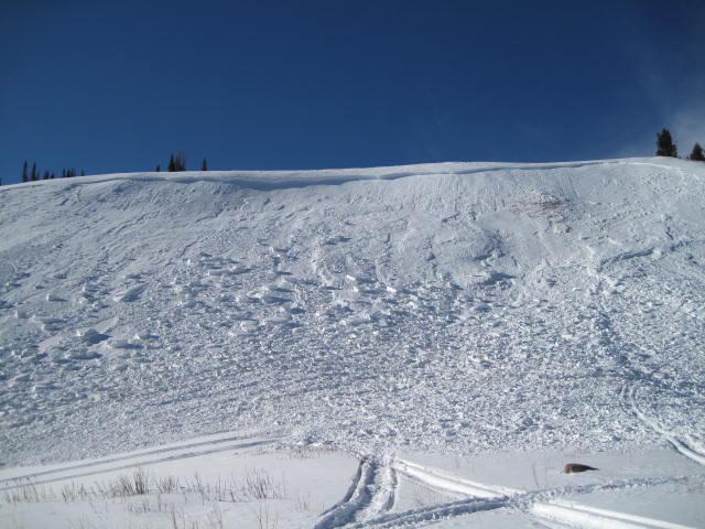 1'-4' deep and approx. 300' wide, this avalanche wasn't reported to us, so we can only speculate. Given the current snowpack structure climbing anything steep is nearly impossible and we think this avalanche was triggered low on the slope. The rider collapsed the slope and basically kicked the legs out from under the slab, releasing the whole slope.
