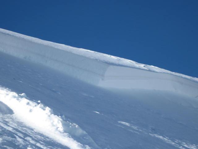 This photo clearly shows a distinct dust layer formed during last Friday's big winds. The avalanche broke to very weak snow near the ground. These are tricky avalanche conditions because the slab will feel very solid under our sled or skis, luring us into steep avalanche prone terrain.