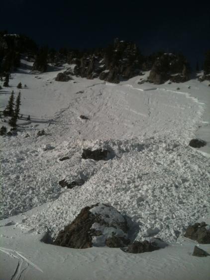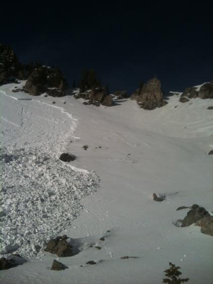 Sorry for the late update but this happened last Tuesday morning. I was going out to poke around the Gargoyles in Dry Fork. There was not very much snow on the ridge which made it difficult to even get out there, even where I entered the snow pack was thin. I entered from the tiny chute skiers left, which was corn. Made 2 turns and shot across the slope to look at the chutes above, when I was about to stop something made me look back and i watched this thing crack and start moving. I made sure I was not gonna be caught, made a right ski turn and stopped where there was barely any snow near some trees to watch the rest of the slide. Heavy and slow moving about 12 to 18 in. deep. I knew the danger but did not think this slope would go, fortunately i had enough speed to get off of the slab. You can barely see my tracks exiting. After looking at the pics I think I cut the sweet spot of this pitch, probably triggering it at the far lookers left where the pack was weak and thin. There were cracks off about 50 ft. to the lookers right of this slide, where there is a little more south aspect. It seemed barely steep enough to slide and the snow pack was thin and wind blasted. Be careful out there!