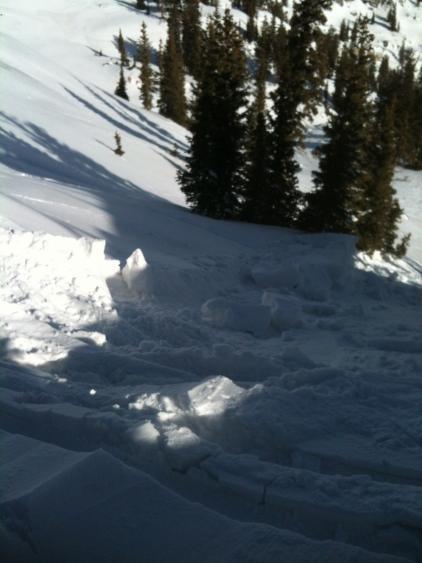 I was planning on this one going in Dry Fork yesterday. I ski cut this pocket with speed. A wind slab 2ft deep at the top but with a broken crown. It started slow and gauged into the lower pack and ran out the bottom. Some big chunks at the end but the debris was not to deep. It cracked out to skiers left at least 50 ft. but didn't move. I jumped on it with no results. Be safe out there.