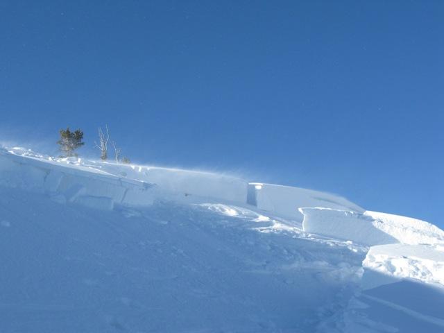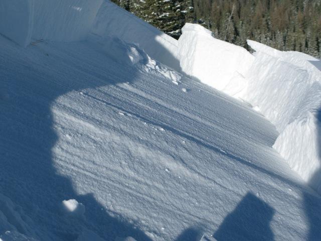 The crown of this avalanche has very distinct layering formed by recent wind events. All this strong snow sits on very weak sugary snow near the ground.... bad combination.