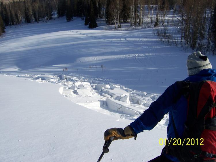 After finding a repeater on GE Hill that ran much larger and naturally, recently (Wed night snow and wind event? last night? or even more recently) we decided to throttle back our approach and as I contoured around the lower angle slope above the wind loaded east face I triggered another 2.5' deep hard slab remotely from a safe position 20' away ( do i sense a pattern ala Wolf Creek Pass, sorry no video, we are AV challenged). It ran on loose facets, unlike the repeater that ran on top of old hard slab and NSF/surface hoar that probably formed in very cold temp prior to Wednesday storm. The Skyline only picked up 2" of new snow Wednesday, but the significant wind event from the west also occurred during that period. In the bigger picture, the area has only picked up 4" of new snow in the last two weeks, but it was enough to tip the scale on some pockets and push other pockets to a hair trigger state. I do not think this is going to go away anytime soon. Additional loading from new snow or more wind will push more over the edge and that would be a good thing, worse case scenerio would be more dribbles of snow and not the clean out event we need.