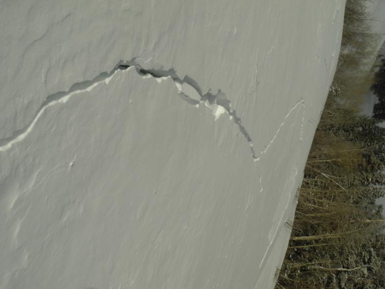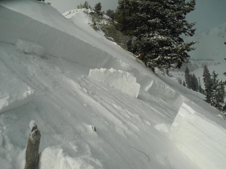 Walking up Chablis Ridge of Timp. collapsed and cracked slope on flat ridge at 8800'. Crack shot up ridge and window paned attached slope, shooting snow up through the open cracks.