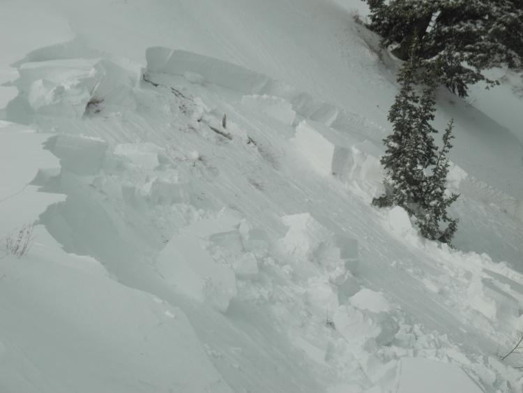 Didn't know that we had produced an avalanche until we followed the shooting cracks and got to the slope below Runaway Cliff at 9150' and saw a 100' wide pocket, avg. depth ~1m, that had released. Later we realized that we had pulled out a much larger pocket well below the ridge we were walking. Much of this terrain produced avalanches during the natural cycle mid day on 1/21. This snow had enough of a bridge over the faceted snow to support a larger slab which was waiting for a trigger.
