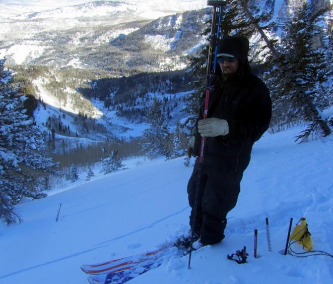Brett Kobernick, one of the most innovative garage scientists I know testing out his latest. Ski Pole Penetrometer. Put your orders in soon, this is going to be a cool one.
