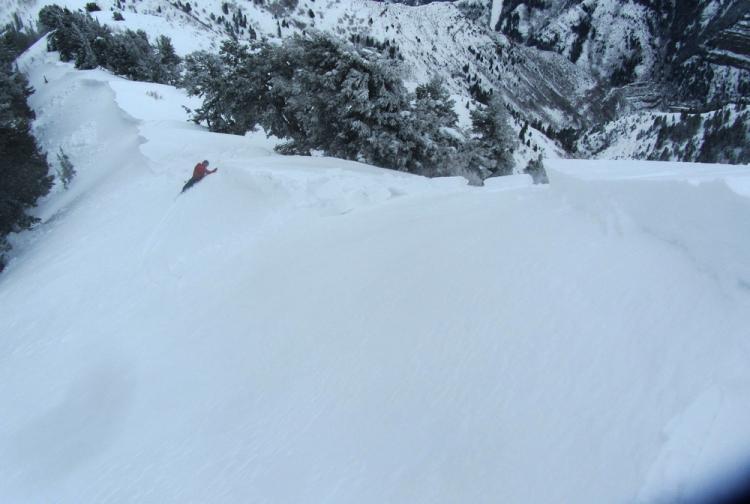 The hardslab that has formed along most exposed ridges is becoming much more sensitive with the continuing strong SW wind. I triggered this HS in Runaway Cliff above Sundance today while just tickling the slope right along the ridgeline. It propagated about 300' back to the east and pulled out a portion of the ridgeline that I had just used on the ascent. The crown averaged 2' but in places it was close to 4' deep. In one portion of the crown I found the rime crust at the failure layer but the majority of the weak layer was simply low density stellars below a 1F windslab.