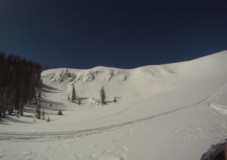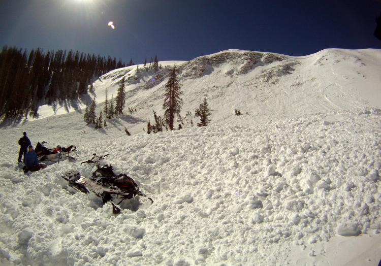 I was the second to go down the shoot, as I got into the top of it it cracked out either side of me and I had no choice but to ride it down. Gave it full throttle and hit the rock lump 1/4 of the way down and jumped 50-60 feet landed and gave it another full throttle rip and hit the toe of the avy. That sent me flying in front of the avy as I did that the sled and my face met and it was a yard sale at 60mph! Avy rolled me and the sled and buried both. Stopped with my head and one arm at the surface. The crew was on me fast within 10 seconds. They had me out in 1 minute or less. My face hit so hard it ripped my goggles and visor off and the chin strap choked me hard, luckily it stayed on. Came out with a bloody nose, mouse over the left eye, sore throat, and knot on the collar bone. Sled started right up, we gathered some parts and pieces up and we continued on to the next one. This slide was the firts of 3 we set off today. No one else was caught in the other two.