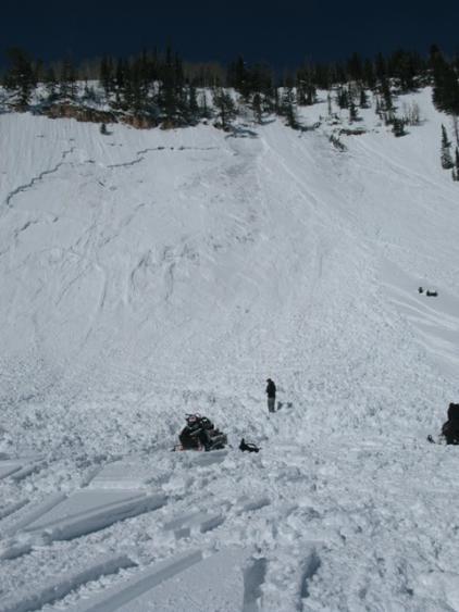 A local snowmobiler and his wife set out for an afternoon of low angle riding. Planning to stick to mellow terrain they left their avalanche rescue gear in the rig. As they pulled up to Hoyt Peak they met another group they knew and started climbing a steep east facing slope. Multiple tracks are on the slope when it breaks above him. Tyson tries to throttle off the slab but got thrown from his machine and held onto the bumper, getting completely buried in a slight depression at the toe of the slide.