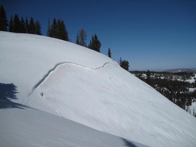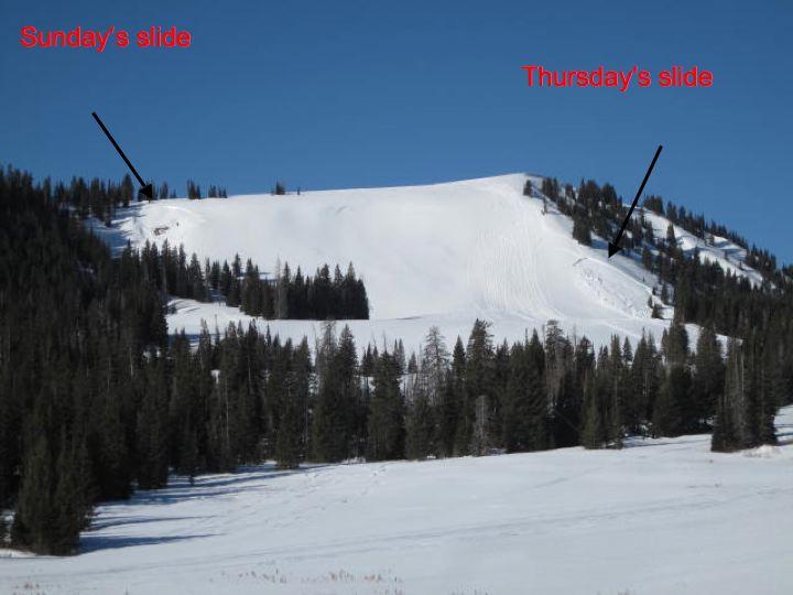 This slide was likely from last Sunday and not quite sure what the trigger is? There are sled tracks at the bottom of the slide, but I cannot tell how high on the slope the riders were since the debris is covering-up most everything. This area is a small, east facing, wind loaded slope and very steep with a nasty terrain trap at the bottom. I was not comfortable getting into this slide to look at it, since there was still a fair amount of hanging snow above.