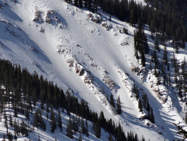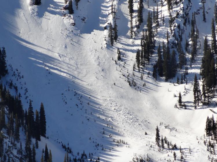 Looks like this avavlanche happened over the last few days ?The crown and debris were pretty fresh looking, at least from a distance. Most of the north and east aspects still have the chalkey look of wind slabs and it looks like windloading is what triggered this slide.